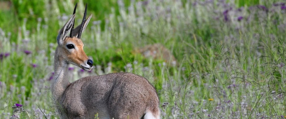 A majestic fallow deer with spotted coat and large antlers walks through grassy terrain at Blue Crane Farm in Dullstroom Blue Crane—South Africa’s national bird—standing gracefully in tall grass at Blue Crane Farm in Dullstroom